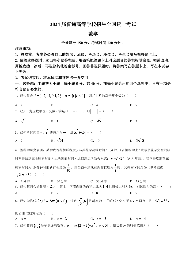 2024届普通高等学校招生全国统一考试青桐鸣大联考 数学