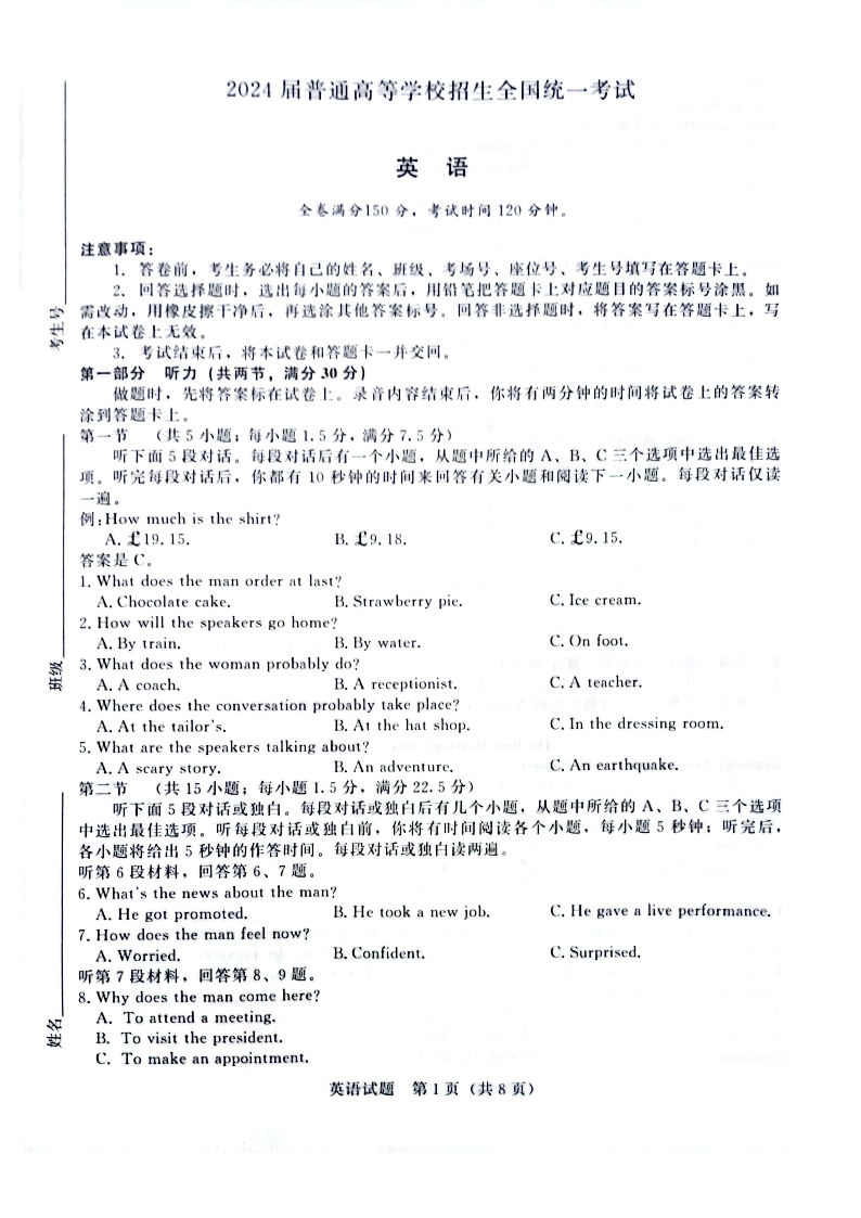2024届普通高等学校招生全国统一考试青桐鸣大联考 英语