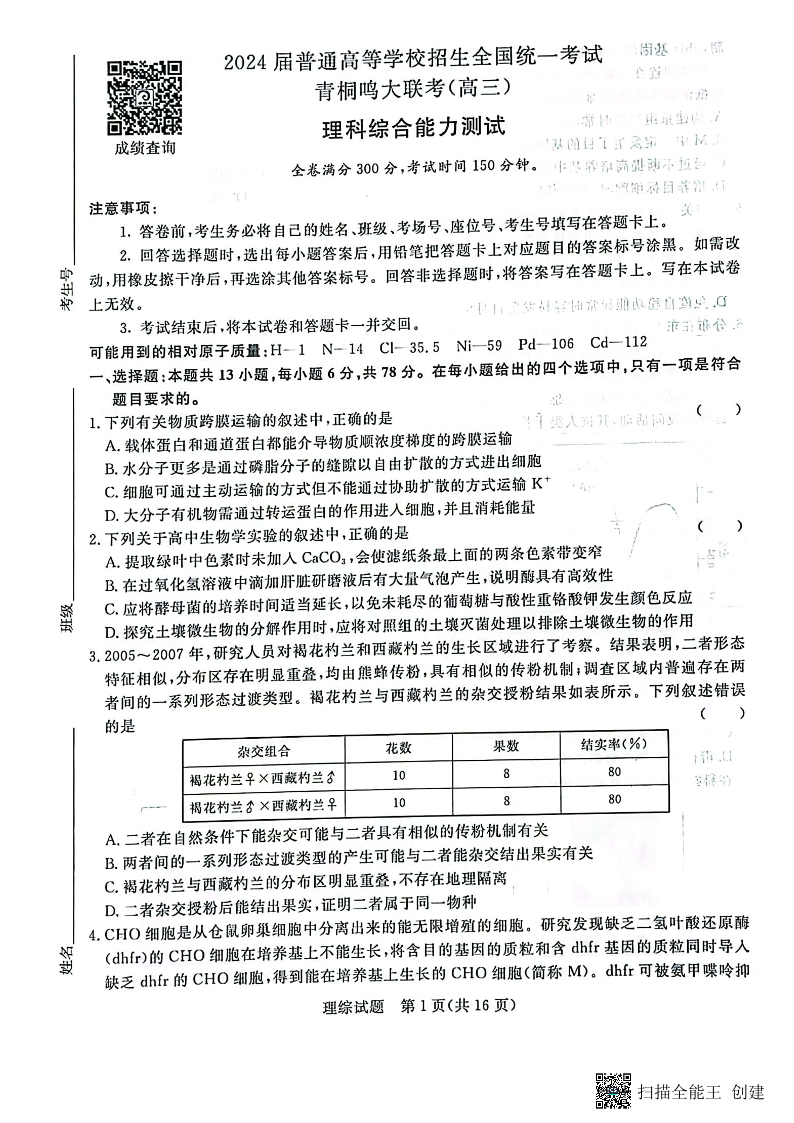 2024届普通高等学校招生全国统一考试青桐鸣大联考 理科综合