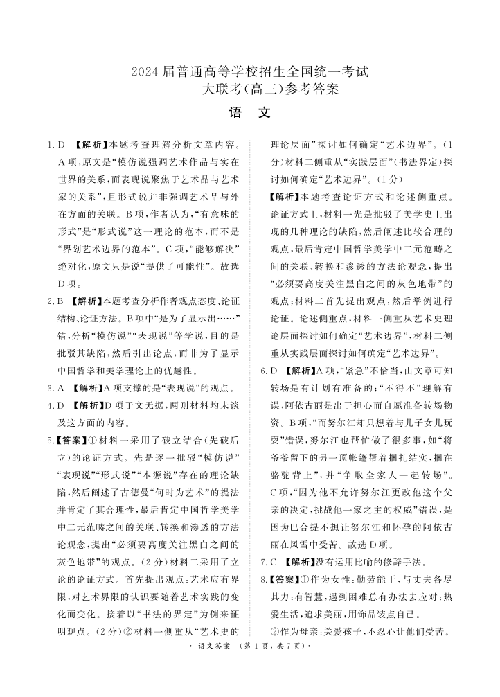 河南省中原名校2023-2024学年高三下学期3月联考 语文答案