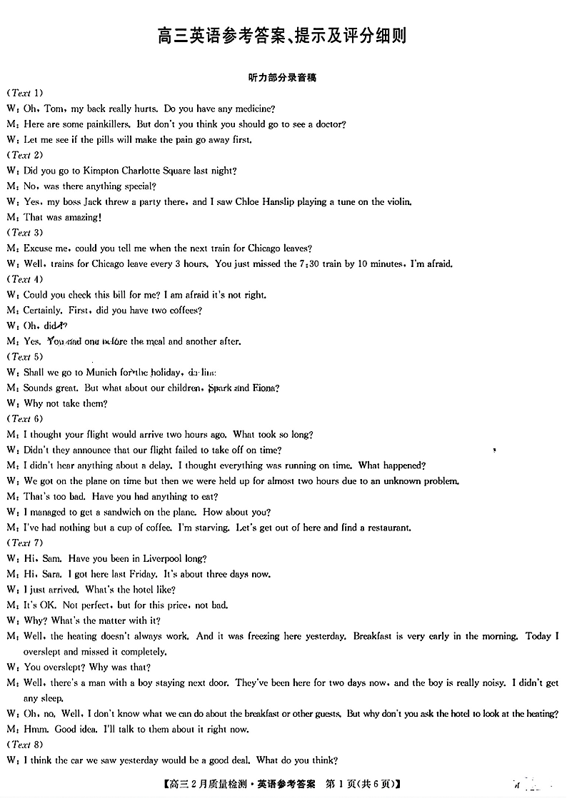 高三英语参考答案提示及评分细则