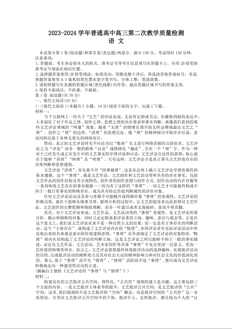 河南省信阳市2023-2024学年高三上学期第二次教学质量检测试题 语文