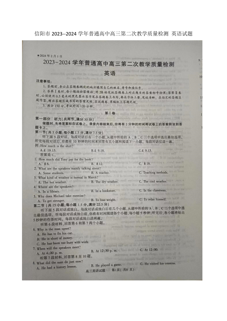 河南省信阳市2023-2024学年高三上学期第二次教学质量检测试题 英语