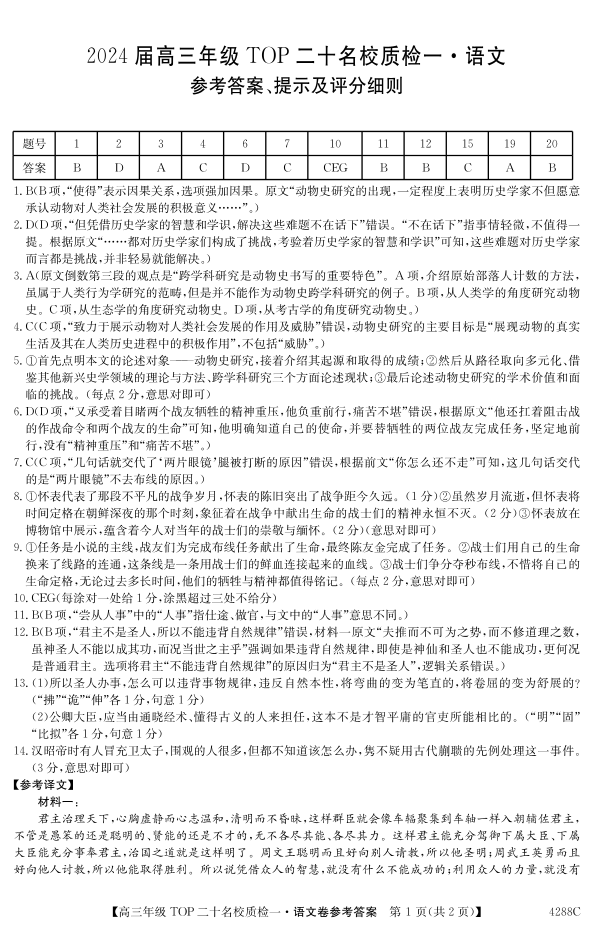 2024届河南省TOP二十名校高三年级下学期质检(一)语文答案