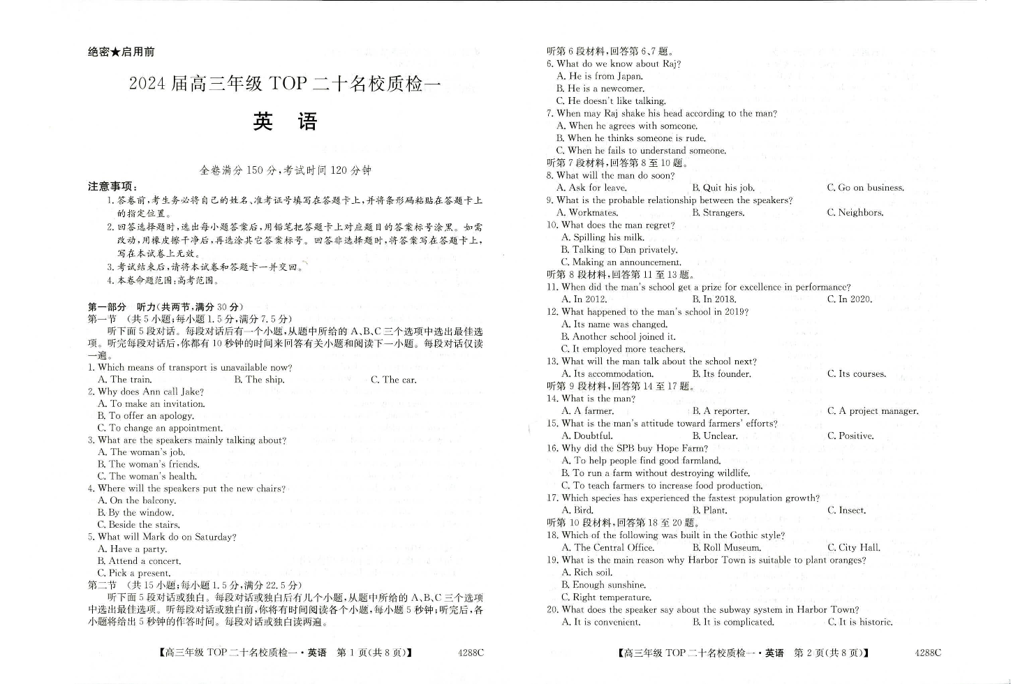 2024届河南省TOP二十名校高三年级下学期质检(一)英语