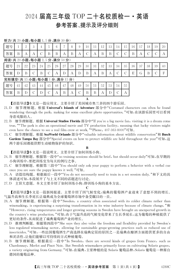 2024届河南省TOP二十名校高三年级下学期质检(一)英语答案