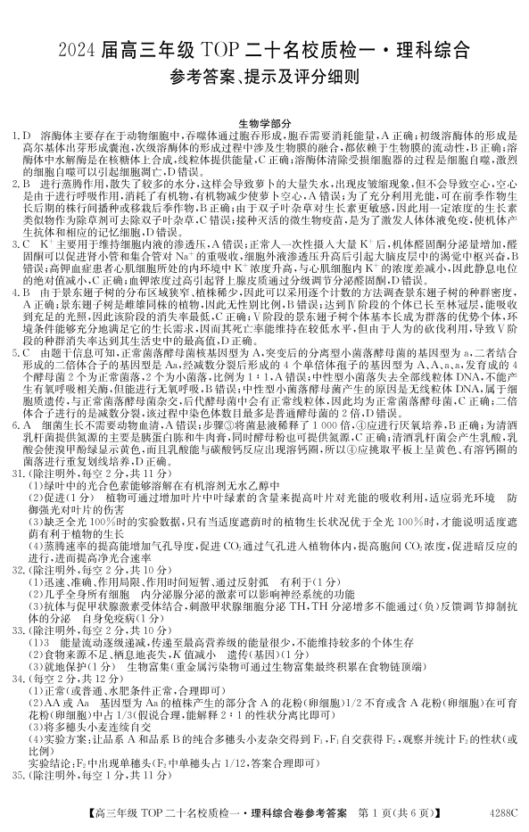 2024届河南省TOP二十名校高三年级下学期质检(一)理综答案