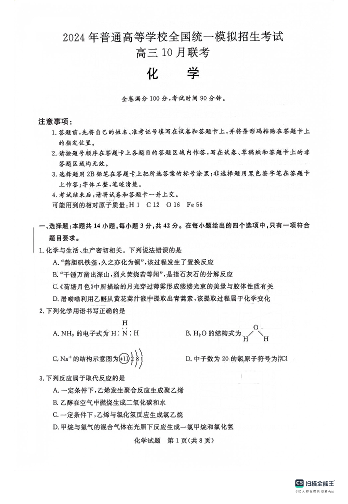 河南省新未来联考2023-2024学年高三上学期10月联考 化学