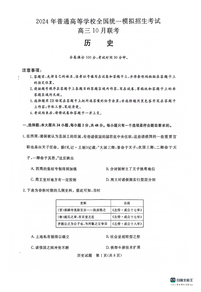 河南省新未来联考2023-2024学年高三上学期10月联考 历史