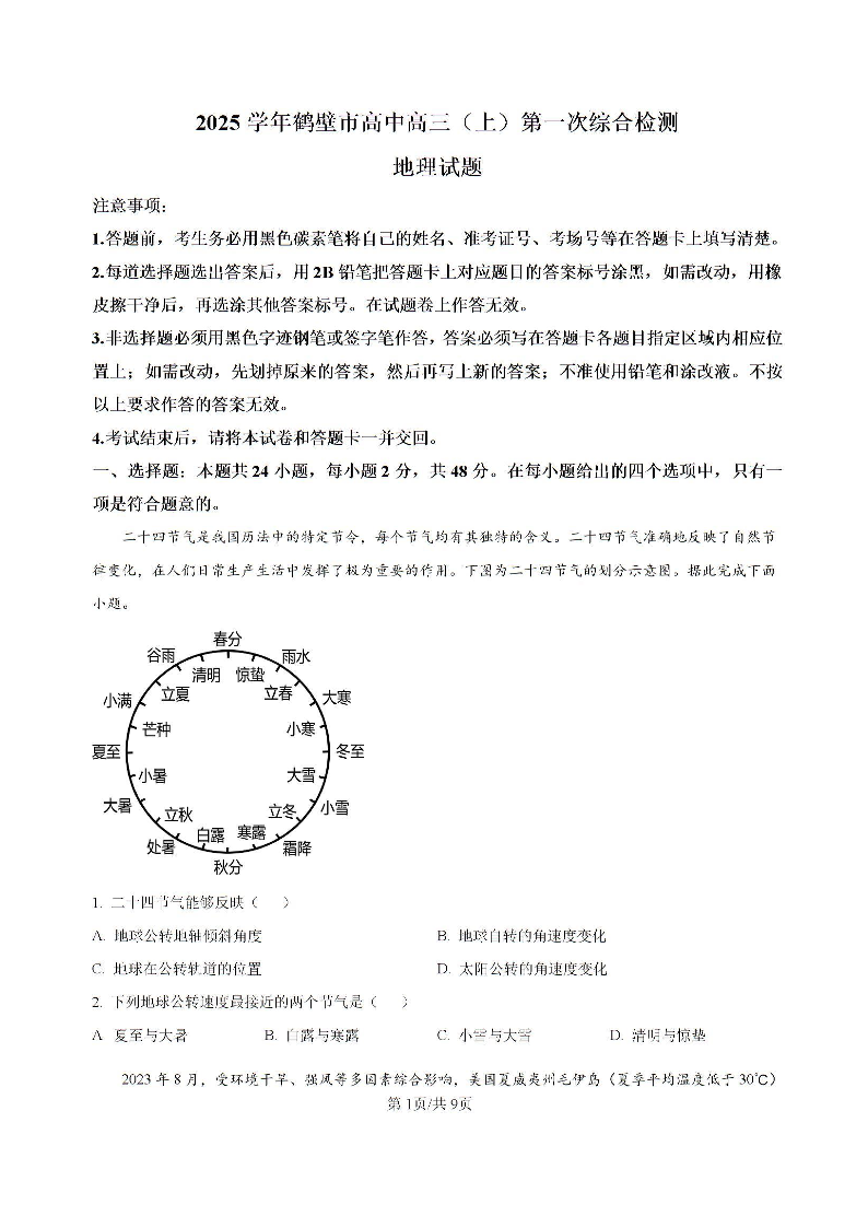 河南省鹤壁市高中2024-2025学年高三上学期第一次综合检测+地理