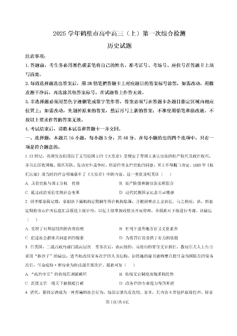 河南省鹤壁市高中2024-2025学年高三上学期第一次综合检测+历史