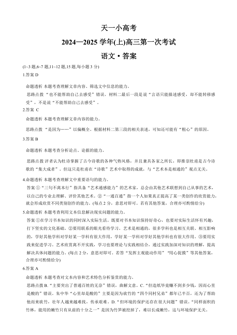 天一大联考2024-2025学年(上)高三第一次考试+语文答案