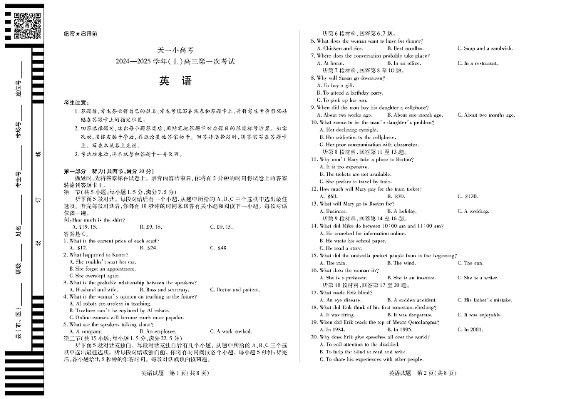 天一大联考2024-2025学年(上)高三第一次考试+英语