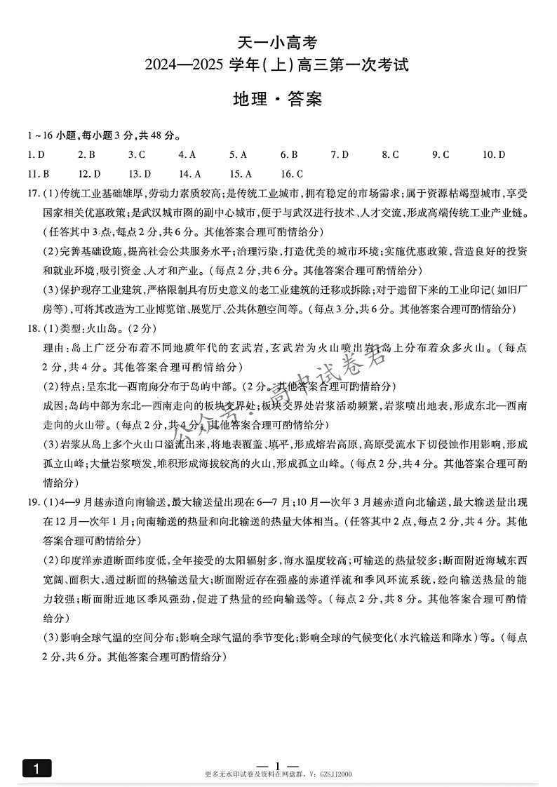 天一大联考2024-2025学年(上)高三第一次考试+地理答案