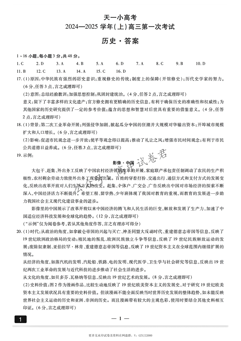 天一大联考2024-2025学年(上)高三第一次考试+历史答案