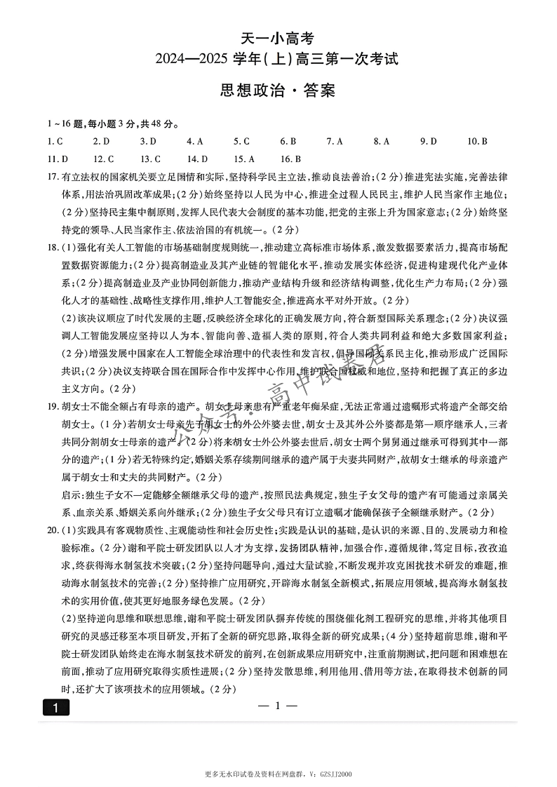 天一大联考2024-2025学年(上)高三第一次考试+政治答案