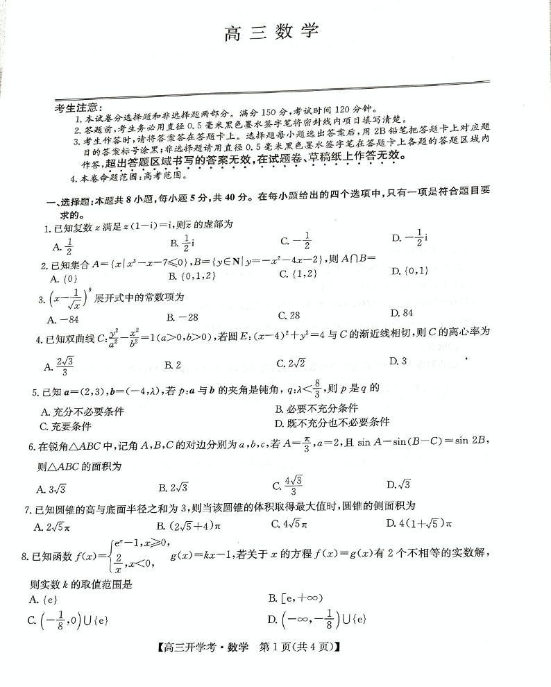 河南省开封五县考2024-2025学年高三上学期开学联考+数学
