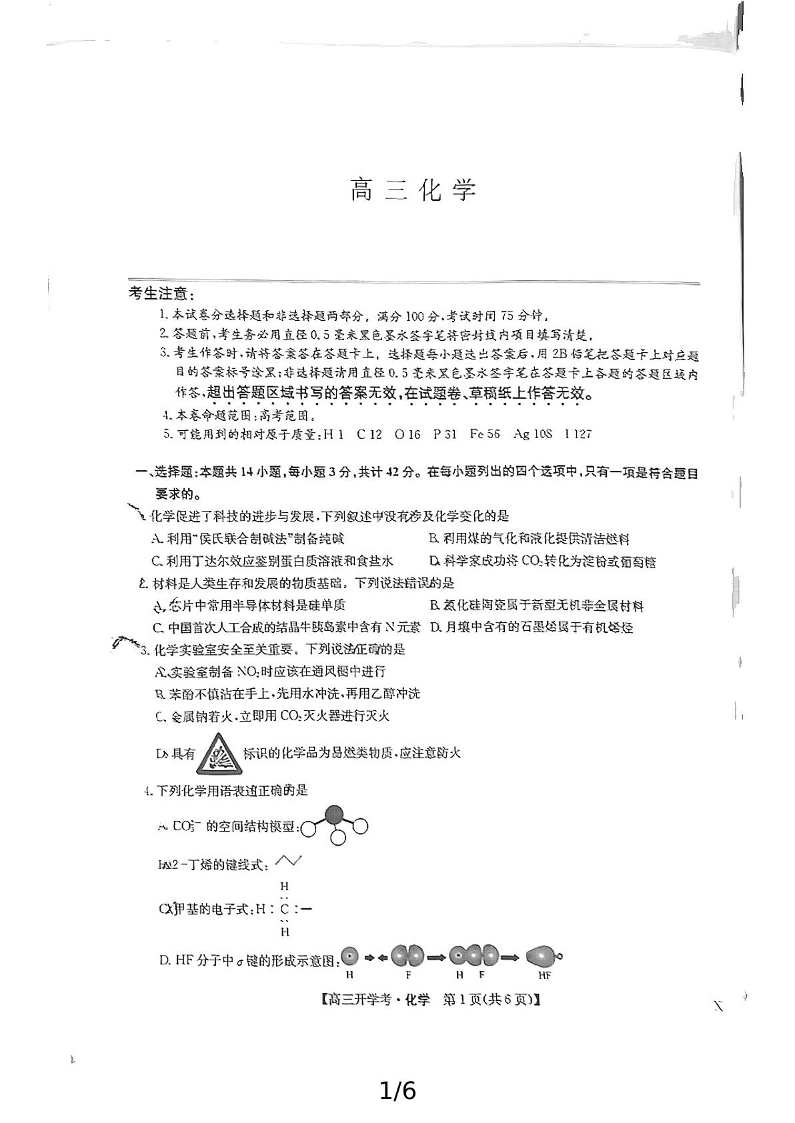 河南省开封五县考2024-2025学年高三上学期开学联考+化学