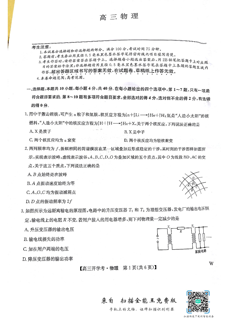 河南省开封五县考2024-2025学年高三上学期开学联考+物理