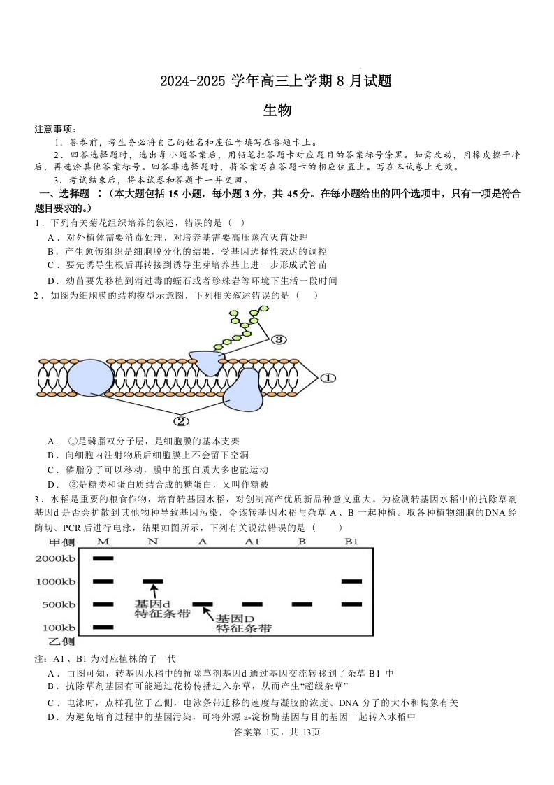 河南省安阳市林州市第一中学2024-2025学年高三上学期8月月考+生物