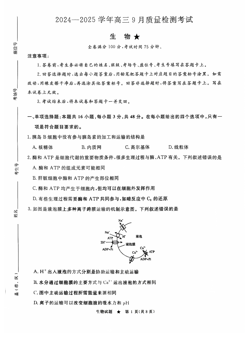 河南省青桐鸣2024-2025学年高三9月质量检测考试联考+生物