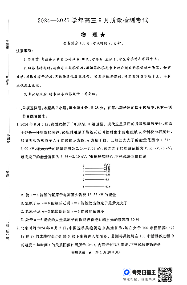 河南省青桐鸣2024-2025学年高三9月质量检测考试联考+物理