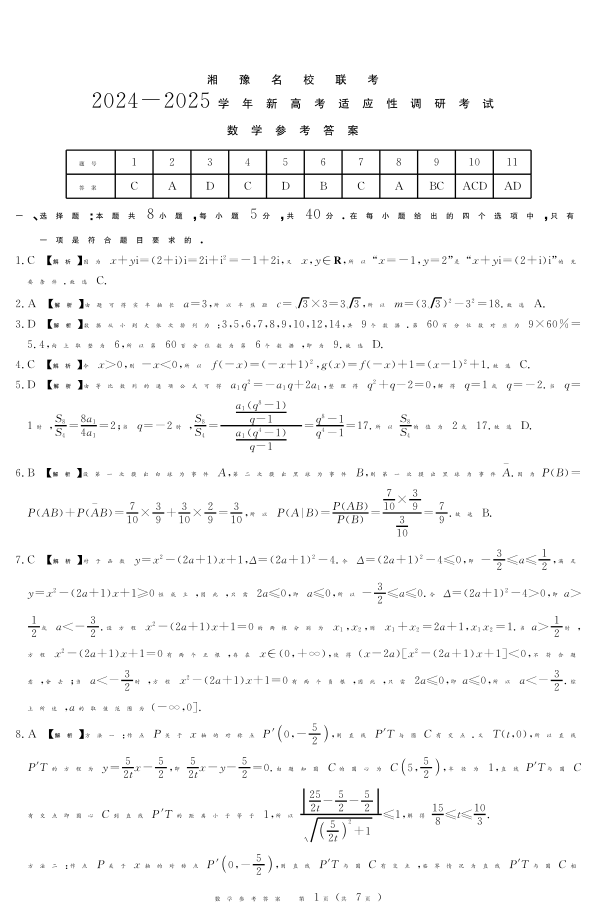 湘豫名校联考2024-2025学年新高考适应性调研考试+数学答案