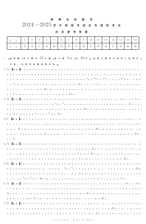 湘豫名校联考2024-2025学年新高考适应性调研考试+历史答案