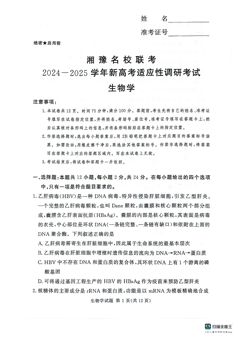 湘豫名校联考2024-2025学年新高考适应性调研考试+生物