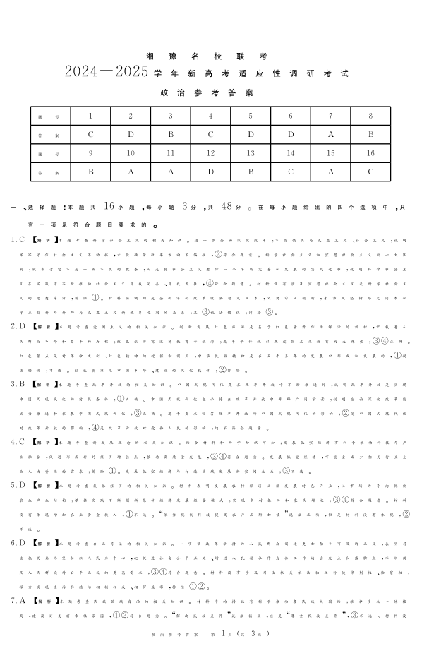 湘豫名校联考2024-2025学年新高考适应性调研考试+政治答案