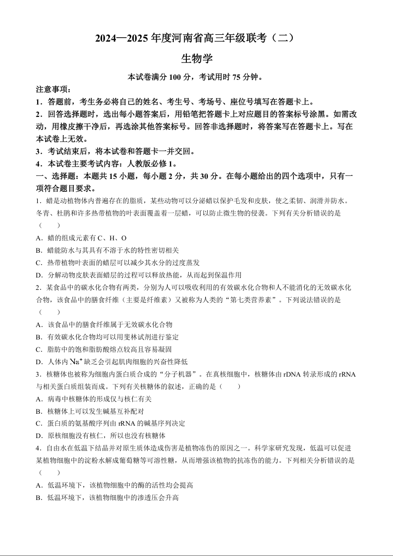 2024-2025年度河南省高三年级联考(二)生物