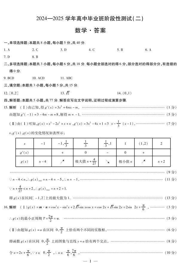 河南省天一大联考2024-2025学年高三上学期阶段性检测(二)数学答案