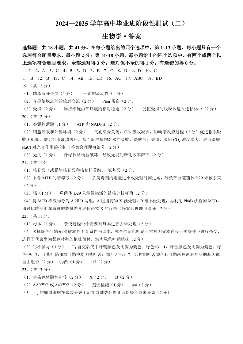 河南省天一大联考2024-2025学年高三上学期阶段性检测(二)生物答案