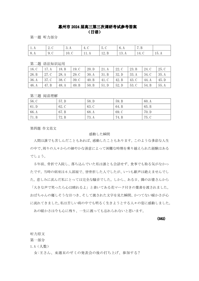 (日语答案)惠州市2024届高三第三次调研考试