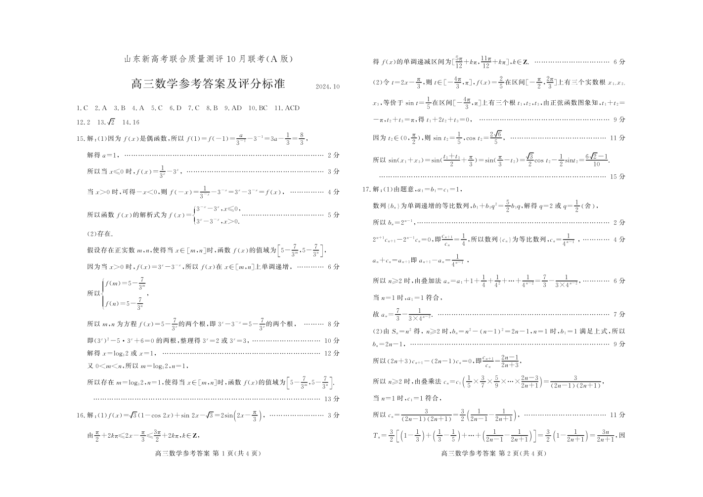 山东新高考联合质量测评高三10月联考试题+数学A答案