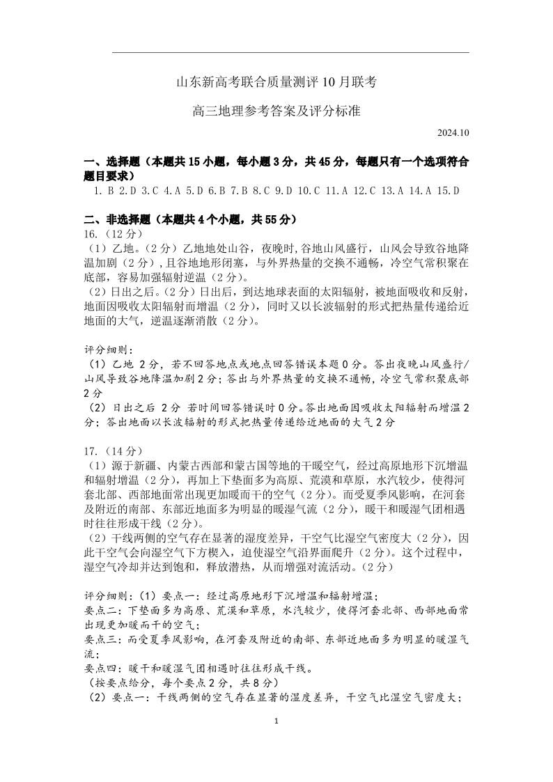 山东新高考联合质量测评高三10月联考试题+地理答案