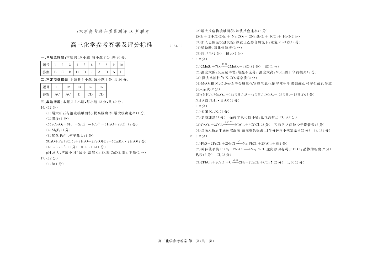 山东新高考联合质量测评高三10月联考试题+化学答案