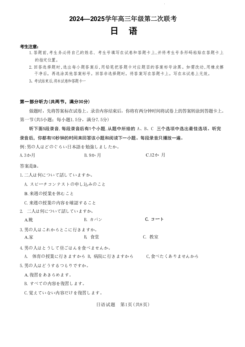 山东省齐鲁名校2024-2025学年高三年级第二次联考+日语
