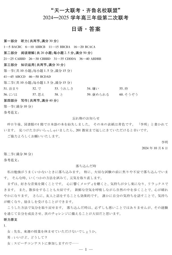 山东省齐鲁名校2024-2025学年高三年级第二次联考+日语答案