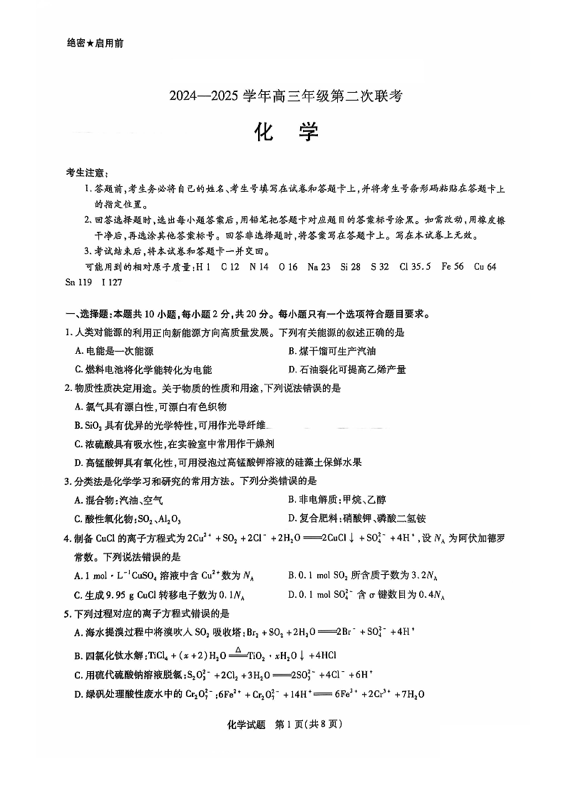 山东省齐鲁名校2024-2025学年高三年级第二次联考+化学