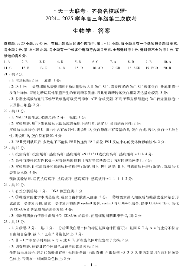 山东省齐鲁名校2024-2025学年高三年级第二次联考+生物答案