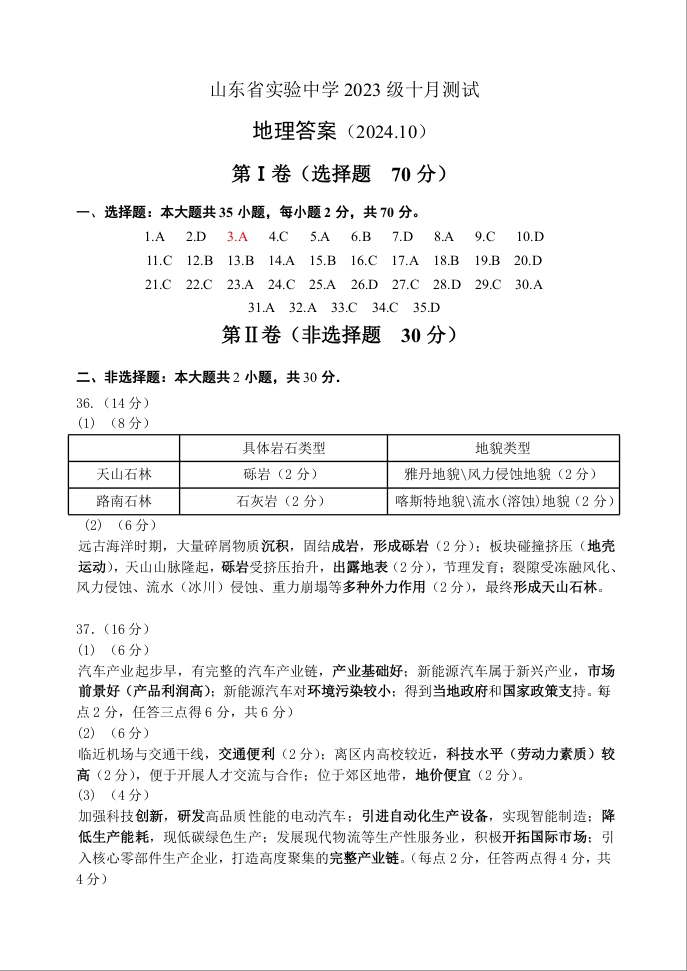 山东省实验中学2025届高三第一次诊断考试+地理答案