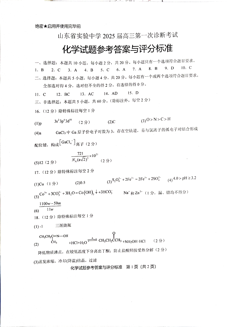 山东省实验中学2025届高三第一次诊断考试+化学答案