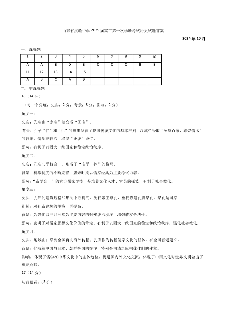 山东省实验中学2025届高三第一次诊断考试+历史答案