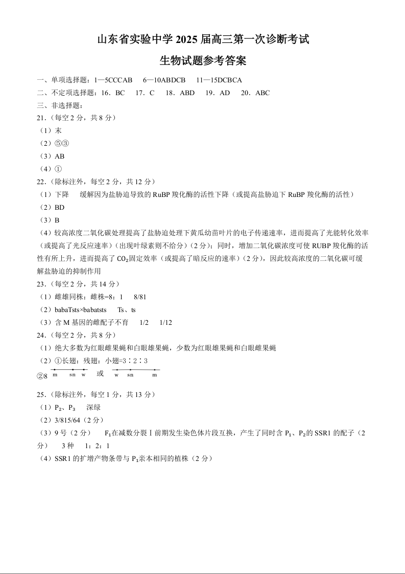 山东省实验中学2025届高三第一次诊断考试+生物答案