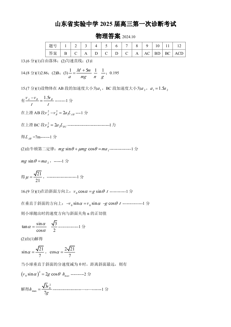 山东省实验中学2025届高三第一次诊断考试+物理答案
