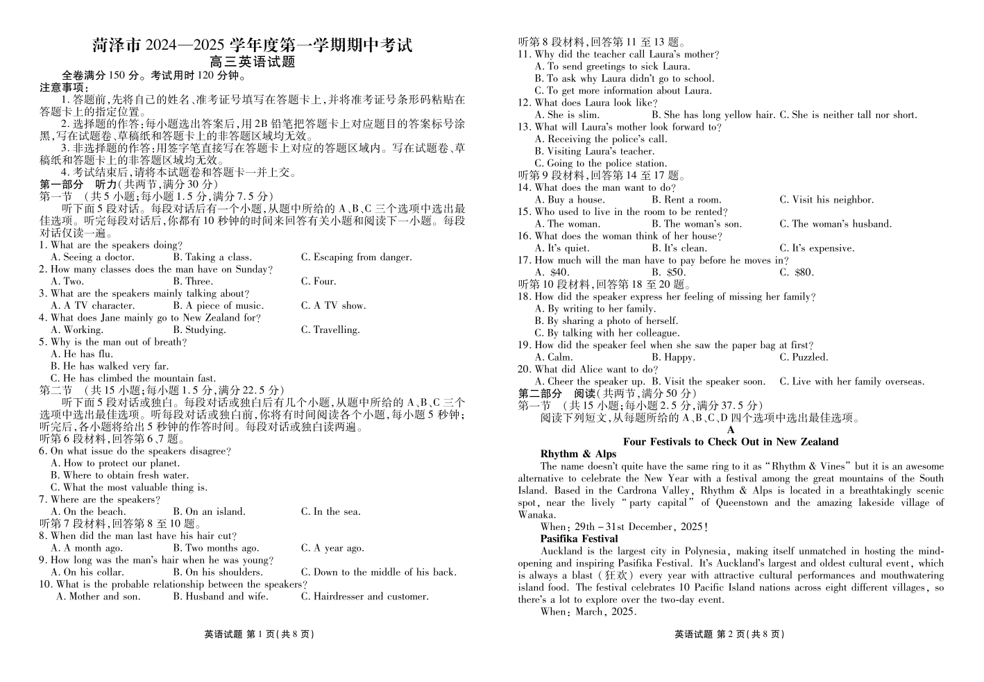 菏泽市2024-2025学年度第一学期期中考试+英语