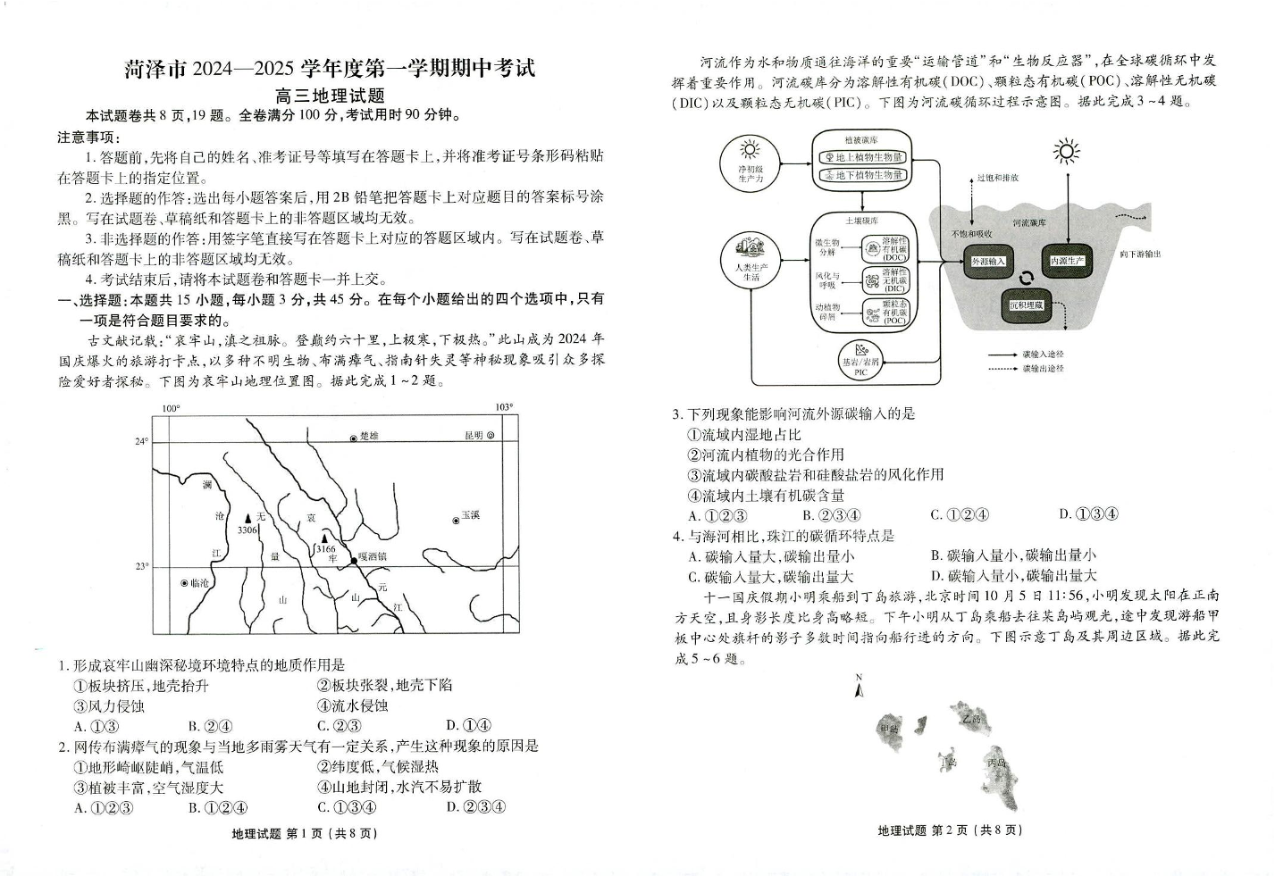 菏泽市2024-2025学年度第一学期期中考试+地理
