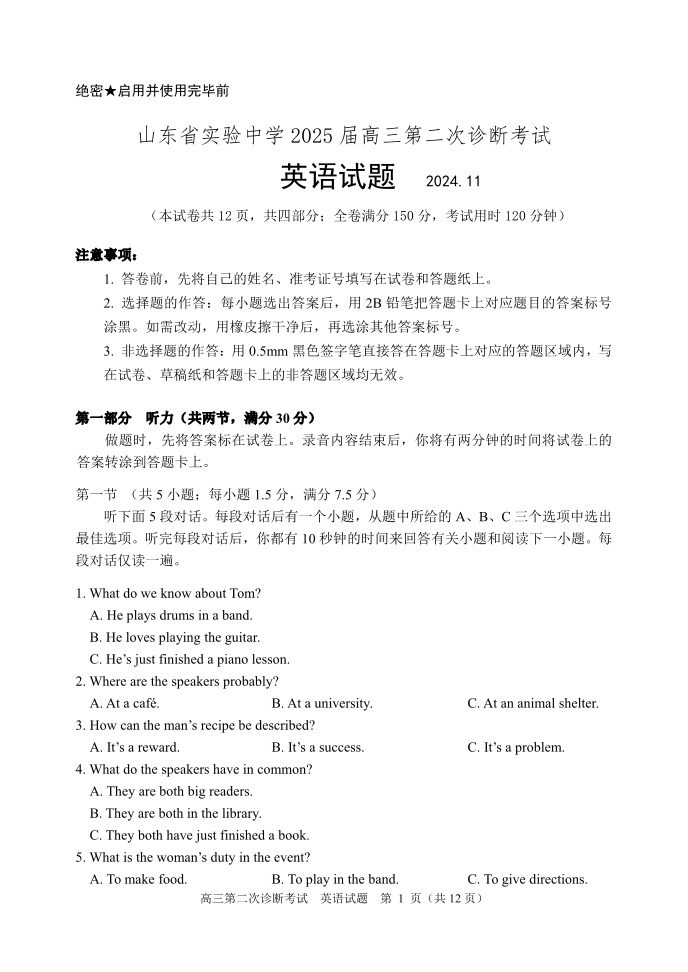 山东省实验中学2025届高三上学期11月期中考试++英语试题