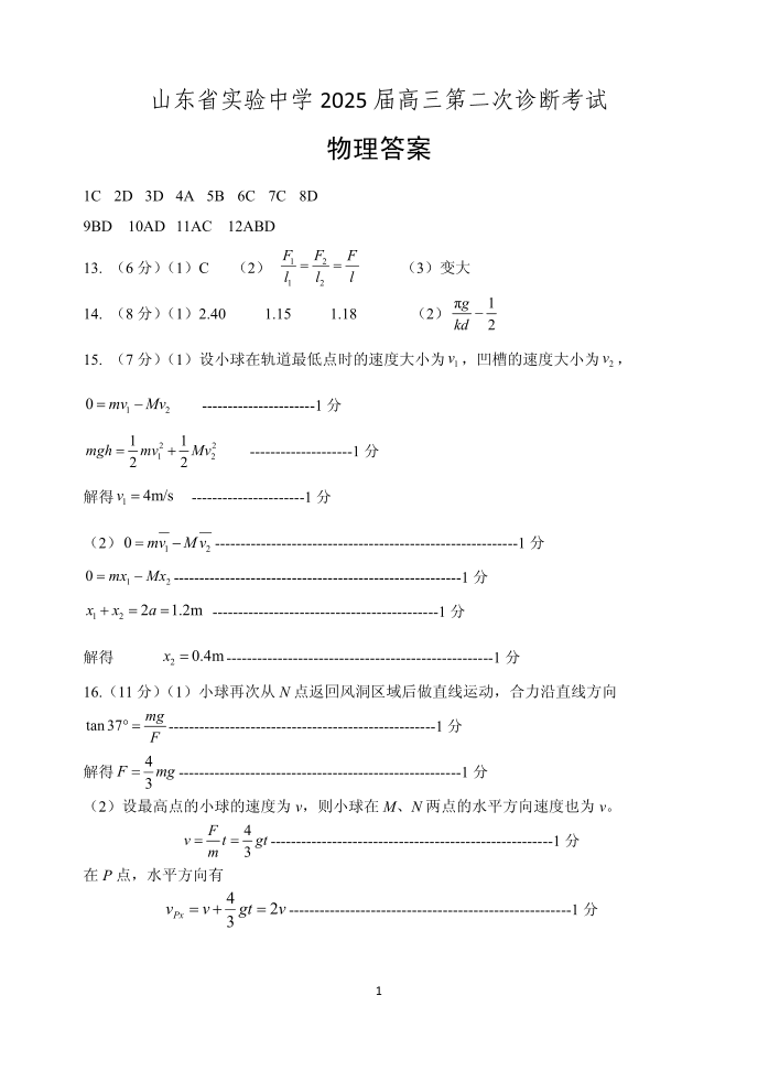山东省实验中学2025届高三上学期11月期中考试++物理答案